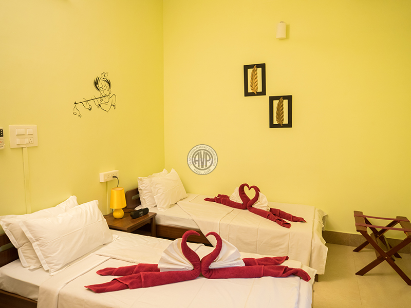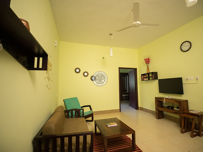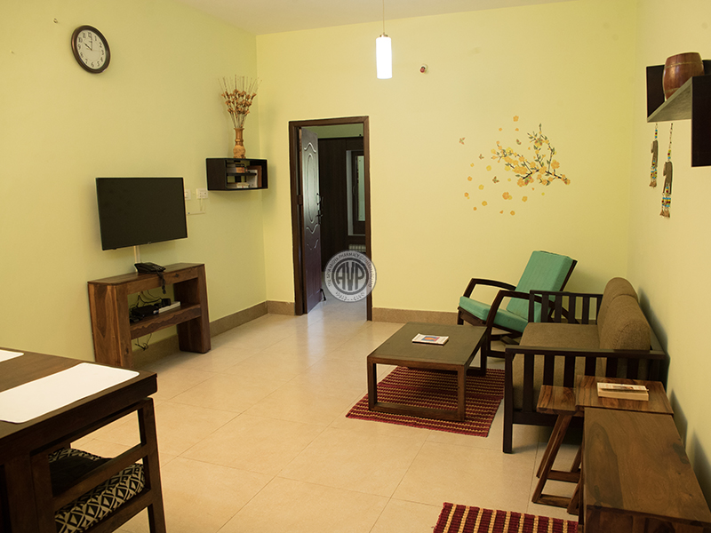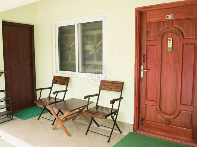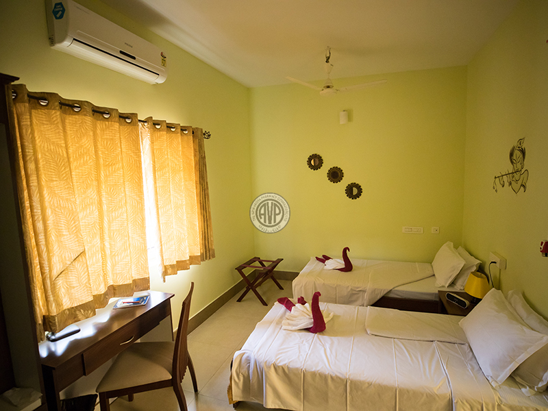 Room Amenities Bedroom, Living room & treatment room / Sit-out / Tile/Marble floor / Private entrance / Windows & doors with mosquito nets / Private treatment room with attached bathroom / Sofa set / Teapoy / Wardrobe with hangers & laundry bag /TV / AC / Linen & blanket / 2 cots & mattresses / 4 pillows & pillow covers / Table lamp / Reading lamp / Dressing table with stool / Study table with chair / Dining table with chairs / Swing / Clock / Laundry basket / Music box / Ceiling Fan / Electric kettle / 2 Coffee mugs /2 Drinking glasses / Tray / Napkin box with tissue / Arm chair / Table for the lamp (between two cots) / Calendar / Luggage rack / Telephone& Telephone table / Books / Socket near the bed / 2 Dustbins / 2 Mosquito repellents / Food menu / Small note pad with pen / Foot mat between cots / Small notice board / 2 small tables / 2 Easy chairs / Book stand / Key hanging stand / 2 Shoe racks / Herbal water for drinking / Packed mineral water – 1