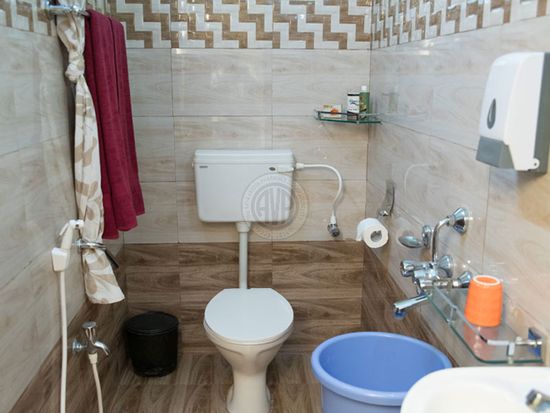 Private Bathroom Washbasin / Towel rod / Toilet - W.C / Bath or Shower / Bath Towel – 2 & Hand towel - 2 / Bucket / Mug / Exhaust fan / Foot mat in the entrance / Pedal Dustbin / Wall mounted mirror / Safety Grab Bar / Soap dispenser / Toothbrush stand / Geyser / Cloth Clips / Toilet Roll / Toiletries (soap & shampoo)